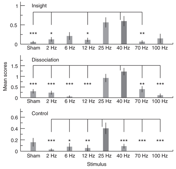 In other words, the 25 Hz and 40 Hz brain stimulation significantly increased Insight and Control, but not to the levels reported in lucid dreams (according the authors’ previous definition). The definition in the present study was less stringent: “Lucidity was assumed when subjects reported elevated ratings (>mean + 2 s.e.) on either or both of the LuCiD scale factors insight and dissociation.”