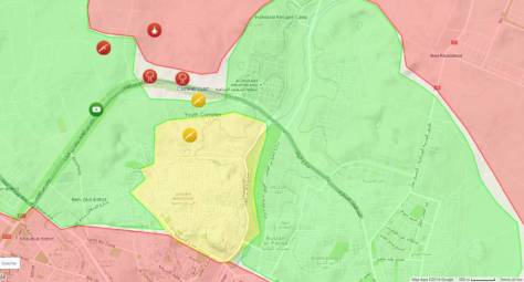 Syrian loyalist positions in the city itself are still a fair bit to the south, but to isolate the rebels the Syrian army doesn’t have to actually reach those — it is enough for it to reach the Sheik Mansour district (yellow enclave on the map) which is Kurdish held. In and around Aleppo the government and the Kurds are in a tactical alliance and united against the largely Islamist rebels.