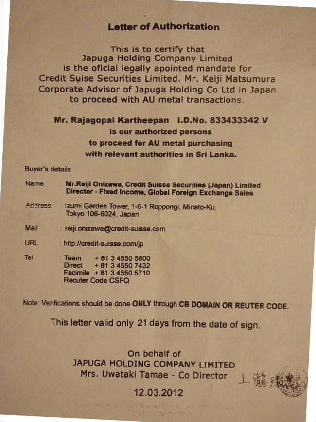 Sri Lankan ex-President Mahinda Rajapakse (HOLDER of the Gold Accounts on behalf of the DEPOSITORS – the Dragon Family) did sell said Gold to Japuga Holding Company, Limited and delivery took place in 2012 to, Japan to Credit Suisse Securities, Mr. Reiji Onizawa, of 20 Thousand Metric Tons; thus, completing this illegal transaction.
