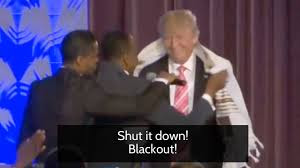 Here at an All Black Church on Saturday – which preaches the Gospel of Jesus Christ in Detroit – Donald Trump is awarded a Jewish Prayer Shawl by Bishop Jackson of this Messianic Church immediately causing the Network to shut down the camera – a Blackout on his appearance.
