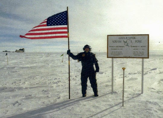 | Brian holding U. S. flag next to the metal pole with yellow top that marked the geographic south pole. Image courtesy Brian. |