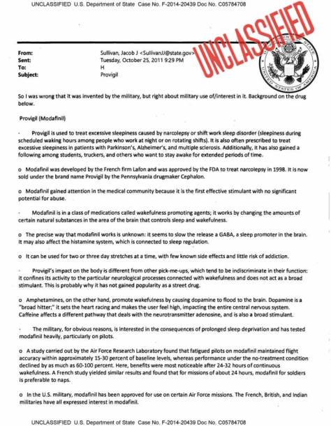 Parkinson Disease, this report explains, is a long-term degenerative disorder of the central nervous system that mainly affects the motor system and which Hillary Clinton’s closest friends have admitted she is in “Stage 3” of, and that while she was the US Secretary of State, in 2011, her top aides sought out the drug Provigil to mitigate the effects of—and as revealed by a once secret US State Department email sent to her by her top aide Jacob Sullivan.