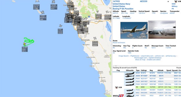 Multiple low-flying aircraft including a Navy EP-3E Aries II, which is used for electronic surveillance, a Navy P-3C Orion, which is used for submarine spotting, and a Boeing P-8 Poseidon used for anti-submarine warfare off California