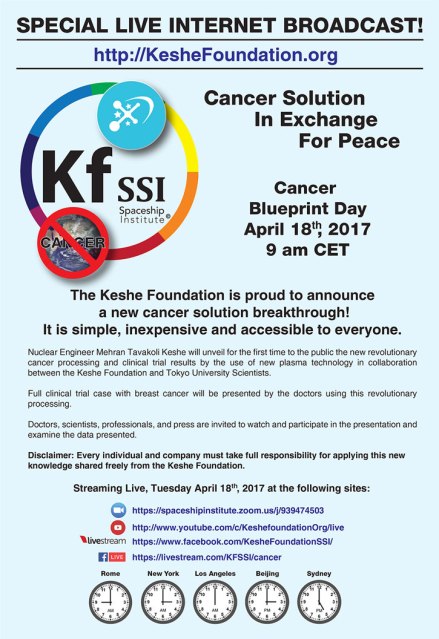 Special information will be released on Tuesday April 18th, 2017 during the Keshe Foundation’s Cancer Blueprint Day, starting at 9 am Central European Standard Time.
