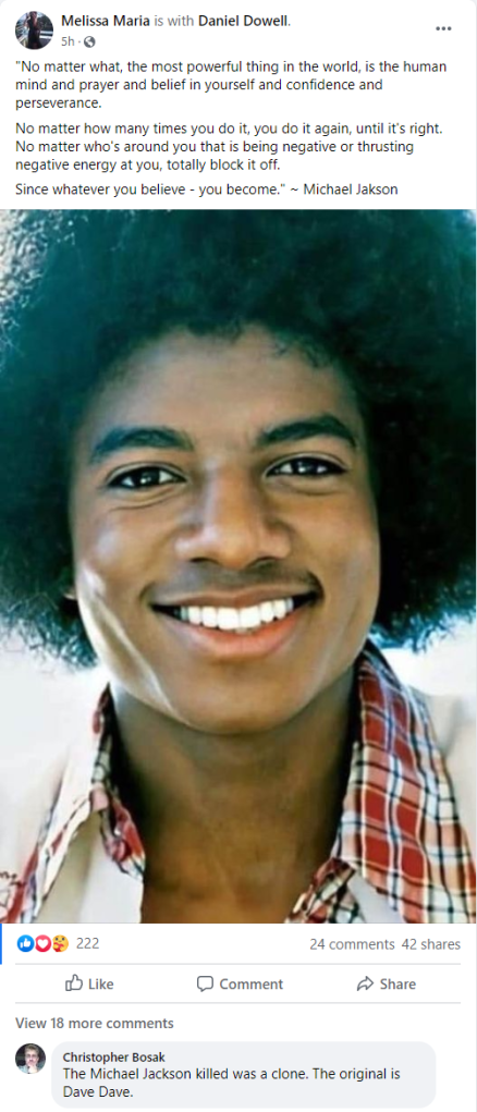 2. Let me share with you. Michael Jackson was cleared of all charges. No child abuse of any kind. The producers who were going to make him perform 50 daily shows were from the Illuminati. It was his time to die. So he faked his own death. There was no body in the casket, empty. He wanted to help Trump with holding record executives accountable. He doesn’t look like MJ now. His hair is very short. He’s still soft spoken and wanting to do good for everyone. He talks to his kids everyday. Love ya MJ. Come perform for us!!