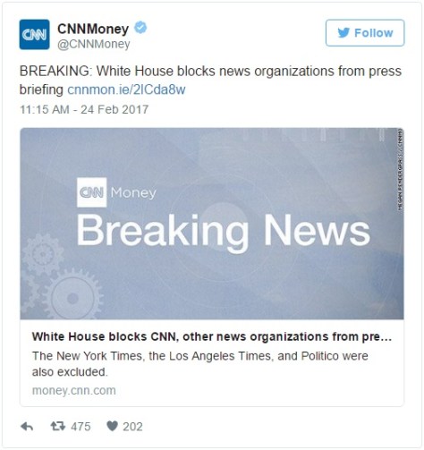 (COMMONDREAMS) Just hours after President Donald Trump launched his latest rhetorical (and predictable) attack on the press during a speech to right-wing activists, CNN and other outlets have reportedly been blocked from attending Friday afternoon’s press briefing at the White House…