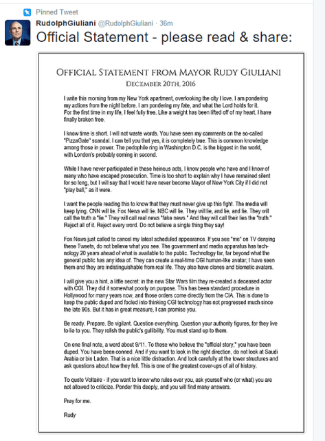 “…RUDY GIULIANI. I WAS TOLD THE OPEN LETTER OF DECEMBER 20 WAS A FAKE. THIS IS TRUE AS HE DOES NOT HAVE A TWITTER ACCOUNT. HOWEVER, PRIVATELY I WAS TOLD THAT GIULIANI HAS HAD AN EPIPHANY OF SORTS, AND IS ON THE SIDE OF LIGHT AND WILLING TO STAY THERE (NOW THAT HE KNOWS WHICH WAY THINGS ARE GOING).